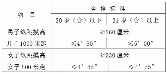 報名資格初審合格的考生方可參加體能測試(初定于10月28日左右進行測試,請?zhí)崆白龊脺蕚?。測試項目和標準如下,其中“縱跳摸高”當(dāng)場測試不超過三次,“男子1000米跑”“女子800米跑”只允許當(dāng)場測試一次。結(jié)果分為合格和不合格。
