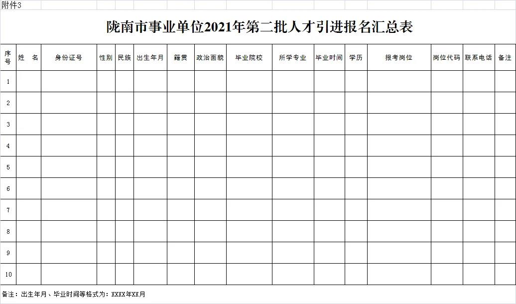 3.報(bào)名材料。現(xiàn)場(chǎng)報(bào)名人員須持畢業(yè)證(含電子注冊(cè)備案表)、學(xué)位證、報(bào)到證、身份證原件及復(fù)印件,《隴南市事業(yè)單位2021年第二批人才引進(jìn)報(bào)名表》(附件2),《隴南市事業(yè)單位2021年第二批人才引進(jìn)報(bào)名匯總表》(附件3),近期2寸正面免冠藍(lán)底彩色照片電子版(JPG格式)。除上述材料,留學(xué)人員要提供由教育部出具的境外學(xué)歷、學(xué)位認(rèn)證書及駐外大使館留學(xué)回國(guó)人員證明。網(wǎng)上報(bào)名人員要建立一個(gè)以“報(bào)名人員姓名+崗位代碼”為名的文件夾,如王XX(A001)。文件夾中包含現(xiàn)場(chǎng)報(bào)名人員提交所有材料的彩色掃描件,其中附件2、附件3須提供電子版。