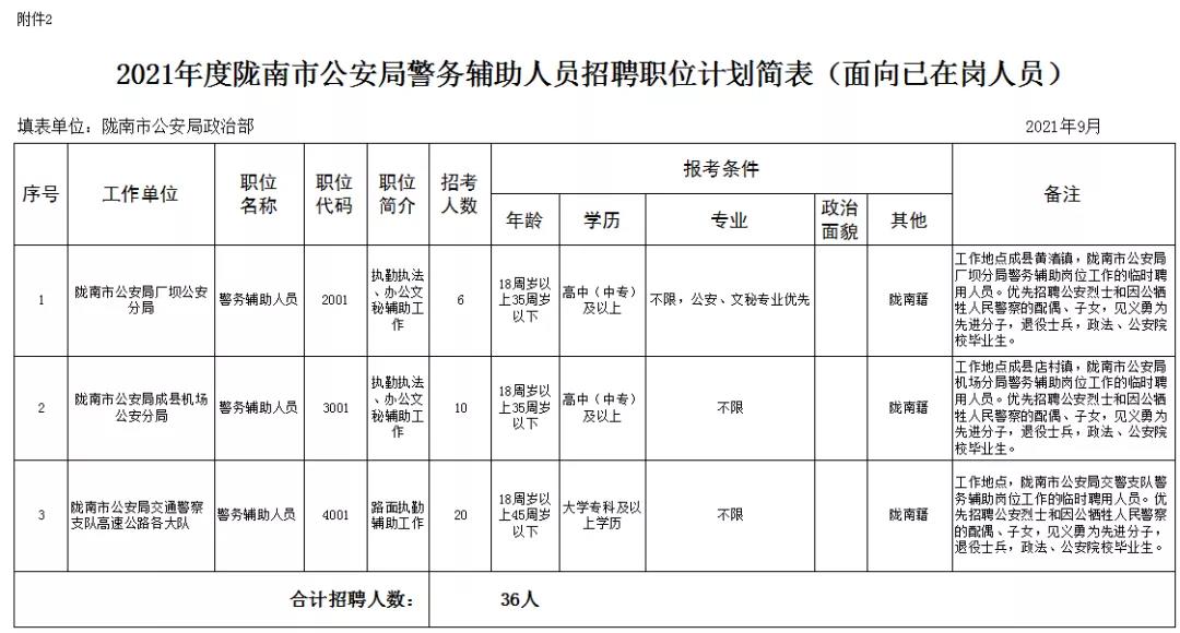 (二)隴南市公安局招聘警務(wù)輔助人員36名(面向已在隴南市公安局廠壩公安分局、機場分局、交警支隊警務(wù)輔助崗位工作的臨時聘用人員),具體崗位如下: