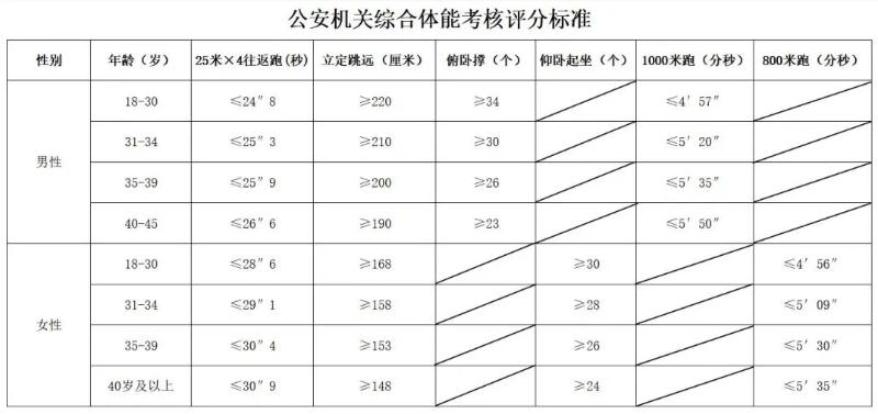 3.測(cè)試內(nèi)容:參照《公安機(jī)關(guān)綜合體能考核評(píng)分標(biāo)準(zhǔn)》(附件2)執(zhí)行。