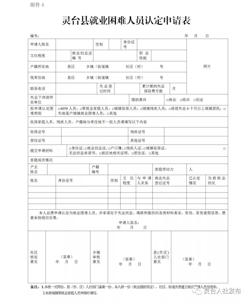 4.靈臺縣就業(yè)困難人員認(rèn)定申請表(此表零就業(yè)家庭人員提供,其余就業(yè)困難人員不提供)