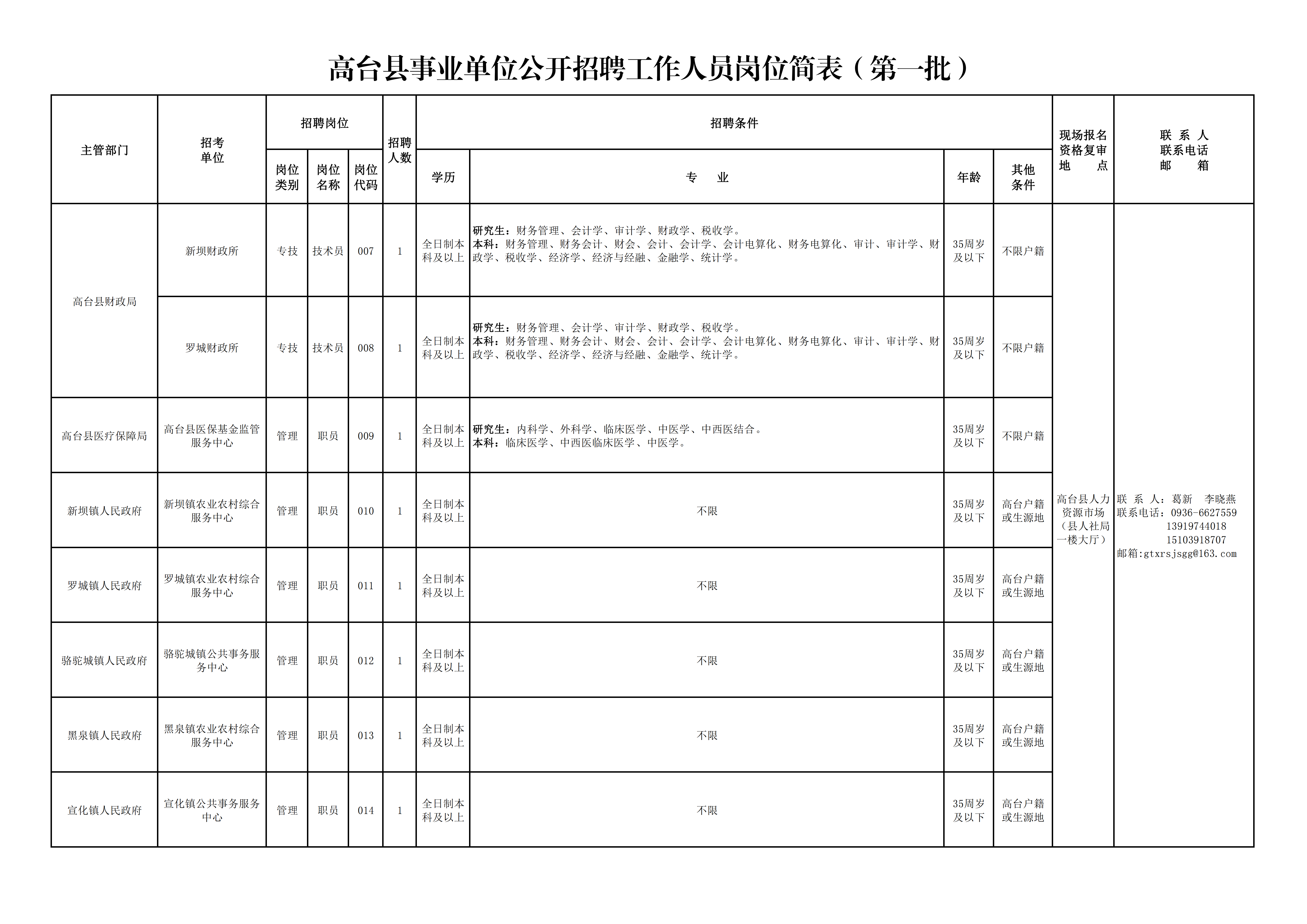 6.具備招聘崗位要求的其他條件,詳見《高臺縣事業(yè)單位公開招聘工作人員崗位簡表》(附件1、附件2,以下簡稱《崗位簡表》)。
