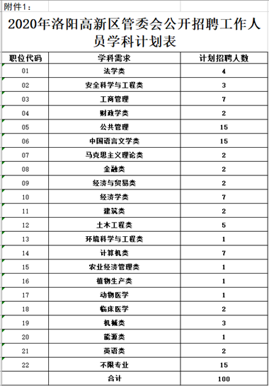 計劃公開招聘100人,涉及學(xué)科類別21個,另設(shè)一個不限學(xué)科門類,各學(xué)科的招聘數(shù)量詳見《2020年洛陽高新區(qū)管委會公開招聘工作人員學(xué)科計劃表》(附件1),各學(xué)科類別的具體專業(yè)要求詳見《2020年洛陽高新區(qū)管委會公開招聘工作人員考試學(xué)科分類專業(yè)對照表》(附件2)。