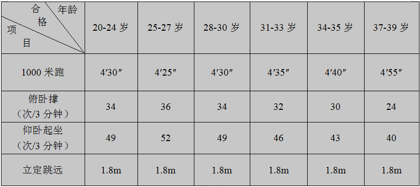 考生以上四個項目,如有一項未達到合格(60分)標準的,不得進入面試環(huán)節(jié)。各測試項目合格標準見下表: