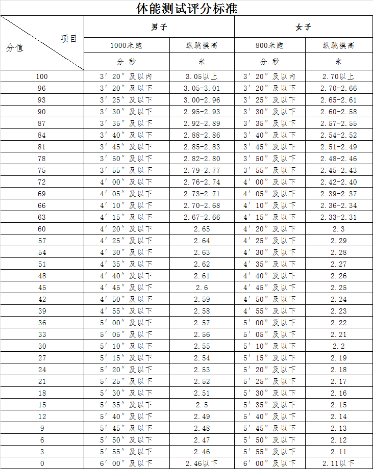 體能測(cè)試成績(jī)滿分100分。體能測(cè)試包括兩個(gè)項(xiàng)目:男子1000米跑、女子800米跑和縱跳摸高,每項(xiàng)滿分為100分。測(cè)試后,按照兩項(xiàng)各占50%的比例合成體能測(cè)試成績(jī)。體能測(cè)試成績(jī)滿60分即為合格,不合格不可參加后續(xù)環(huán)節(jié)。項(xiàng)目及評(píng)分標(biāo)準(zhǔn)如下: