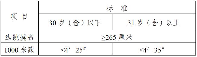2.體能測評項(xiàng)目及標(biāo)準(zhǔn)。本次招聘體能測評共兩項(xiàng):縱跳摸高、1000米跑。體能測評參照《公安機(jī)關(guān)錄用人民警察體能測評項(xiàng)目和標(biāo)準(zhǔn)(暫行)》執(zhí)行。