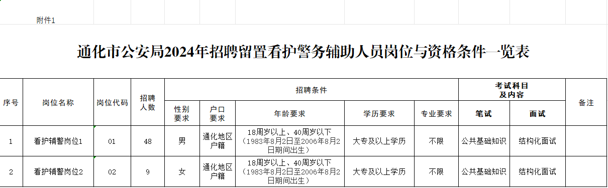 附件:1.通化市公安局2024年招聘留置看護警務(wù)輔助人員崗位與資格條件一覽表