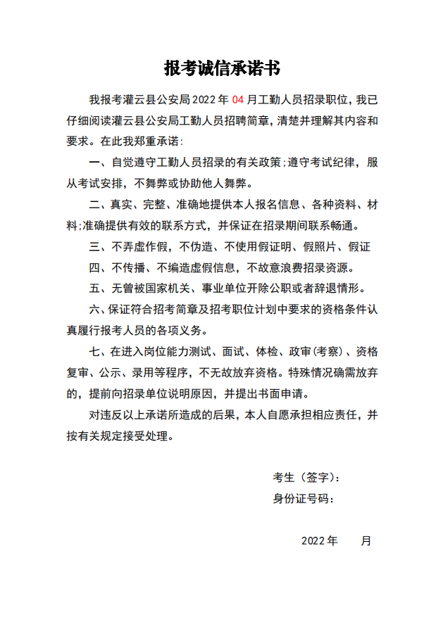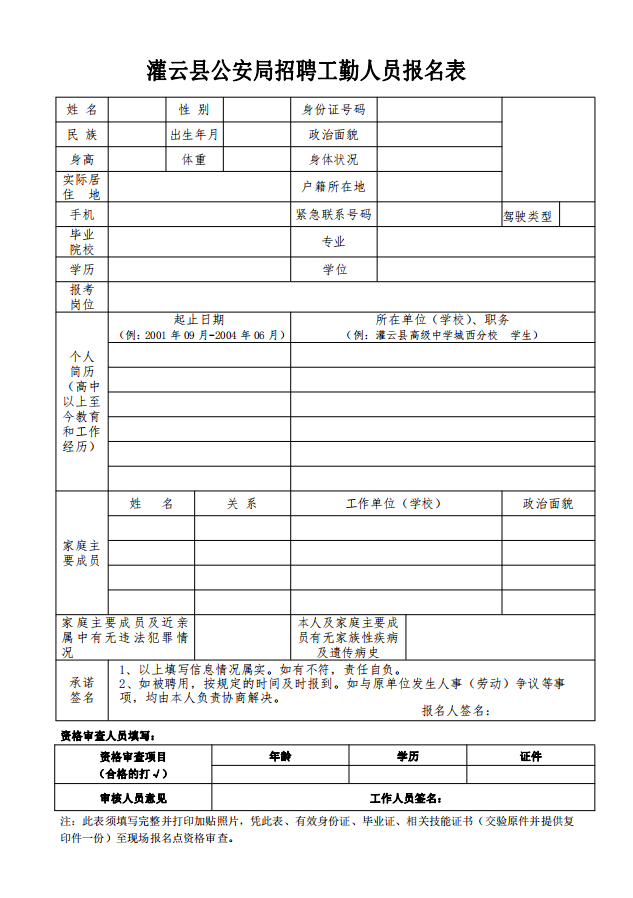 應(yīng)聘人員須按照應(yīng)聘崗位要求,真實、準(zhǔn)確、完整和規(guī)范填寫報名表、報考誠信承諾書,連同應(yīng)聘崗位所需有關(guān)證明材料電子版(可以是PDF、JPEG、JPG等形式),發(fā)送至郵箱:gygazp@126.com,郵件主題為:“應(yīng)聘崗位代碼+姓名+聯(lián)系電話”。郵件接收成功后,將于48小時內(nèi)回復(fù)資格初審意見,如未收到資格初審意見,請及時與灌云縣公安局聯(lián)系,聯(lián)系電話:0518-81868627。