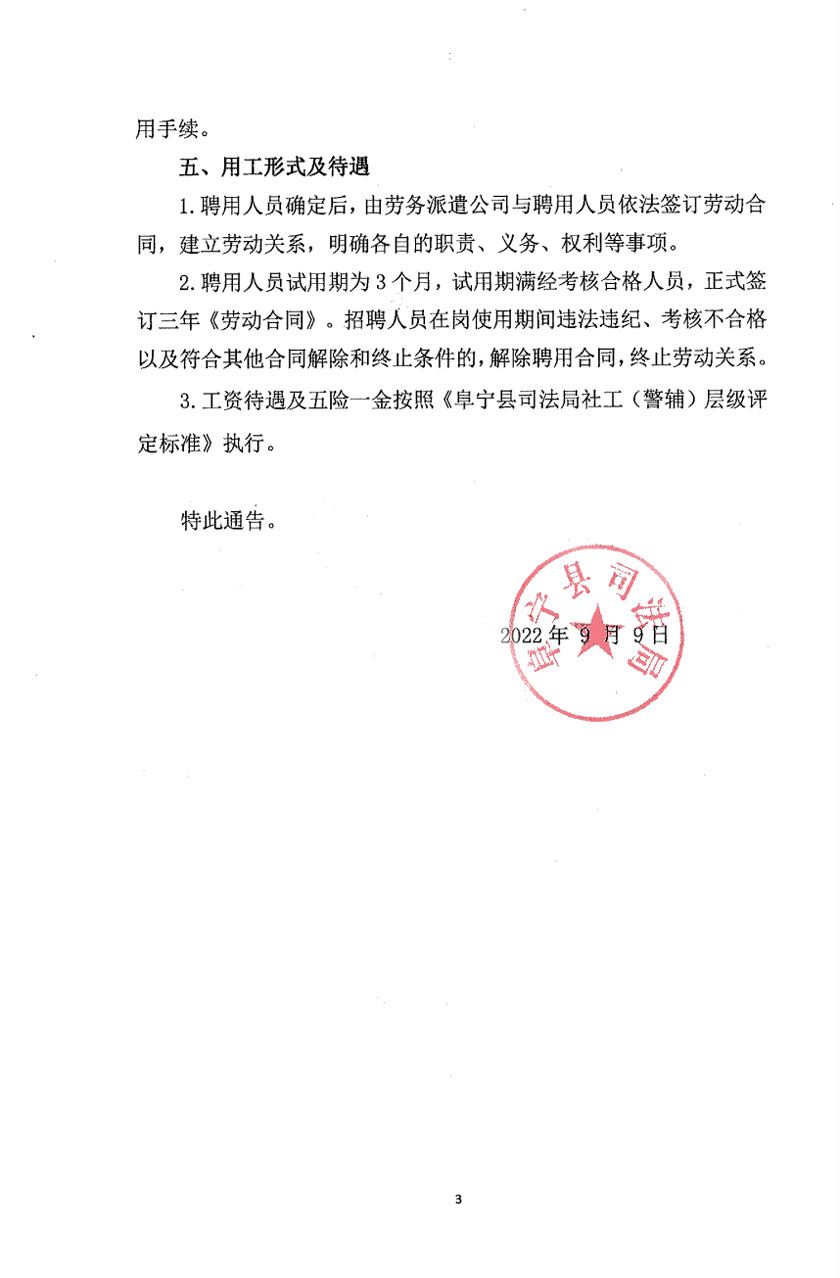 2022-09-19 21:03:19閱讀()阜寧縣人民政府因工作需要,由鹽城市展舒勞務(wù)派遣有限公司代為面向社會公開招聘派遣至司法局所屬鎮(zhèn)司法所從事社工工作的服務(wù)人員?,F(xiàn)將有關(guān)事項(xiàng)通告如下: