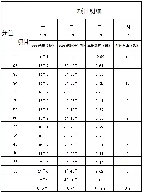 (3)測試項(xiàng)目:1000米跑、100米跑、立定跳遠(yuǎn)、引體向上各占25分的權(quán)重分值(評分標(biāo)準(zhǔn)見附件二)。
