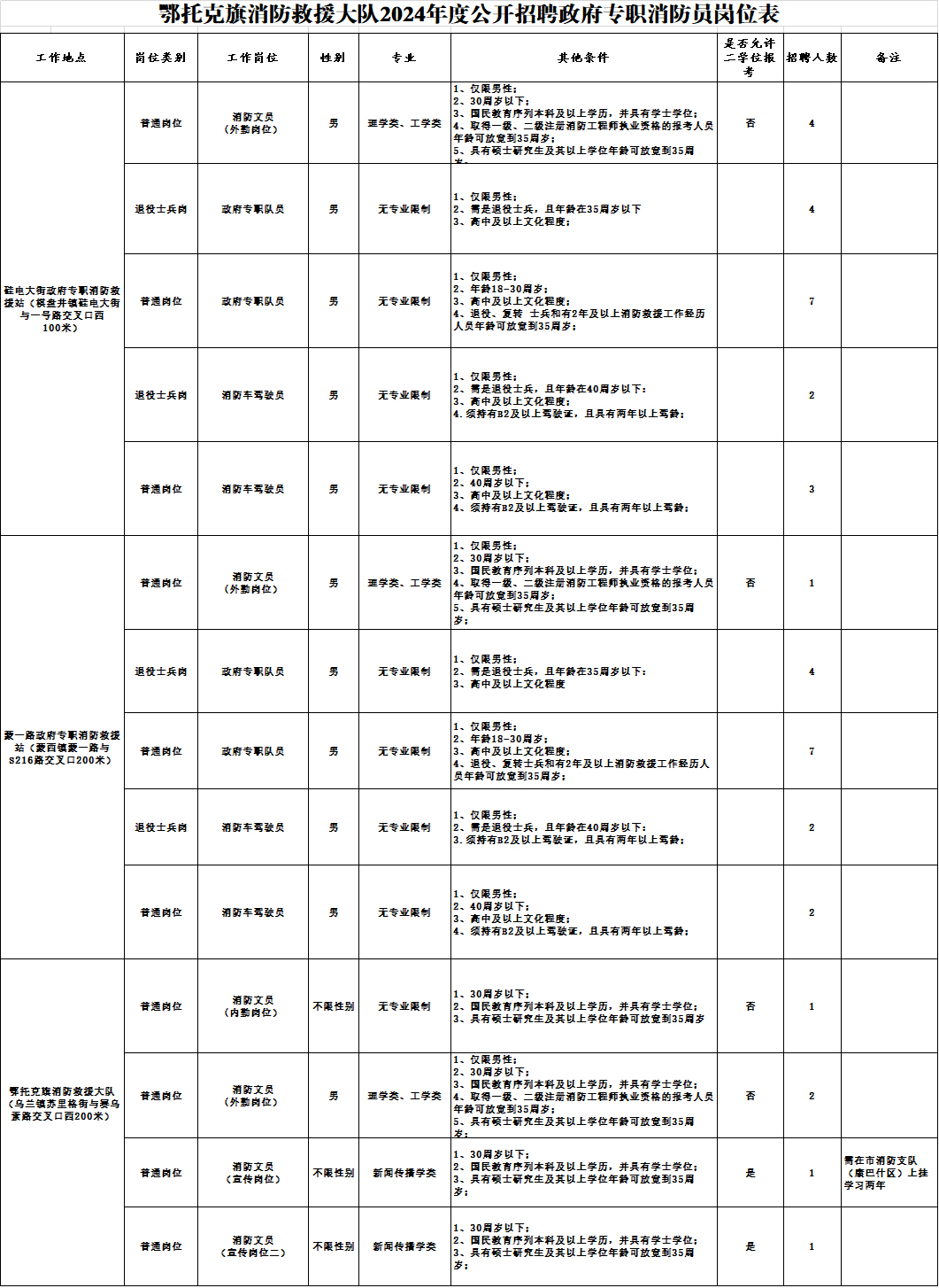烏蘭鎮(zhèn)共計5人,均為消防文員,其中外勤2人,內(nèi)勤3人;棋盤井鎮(zhèn)共計20人,其中消防文員4人,政府專職消防隊員11人,消防車駕駛員5人;蒙西鎮(zhèn)共計16人,其中消防文員1人,政府專職消防隊員11人,消防車駕駛員4人;具體崗位要求詳見《鄂托克旗消防救援大隊2024年度公開招錄政府專職消防員崗位信息表》(附件1)。