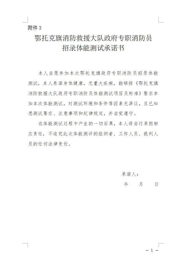 按照《鄂托克旗消防救援大隊政府專職消防員體能測試項目及標準》(附件2)執(zhí)行。參加體能測試人員要在考前簽訂《鄂托克旗消防救援大隊政府專職消防員招錄體能測試承諾書》(附件3),體能測試實行量化評分,滿分40分。測試結(jié)束后按人員綜合成績排名順序,按一定比例確定人選。如單項多人達到滿分以上成績,按照項目的分類,依據(jù)耗時短、距離長、數(shù)量多等原則進行排名。測試分組由現(xiàn)場抽簽決定,全程錄像拍攝,當場公布成績。另本次體能測試設(shè)置合格線,四項分數(shù)低于20分的不予進行錄、補用。