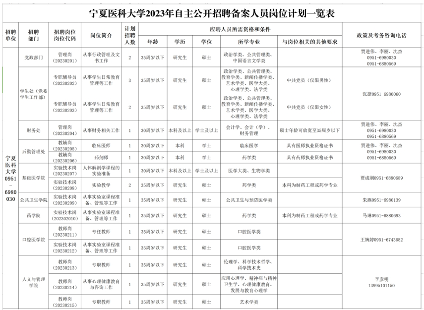 4.身心健康,符合《寧夏醫(yī)科大學(xué)2023年自主公開招聘備案人員崗位計劃一覽表》中崗位條件。