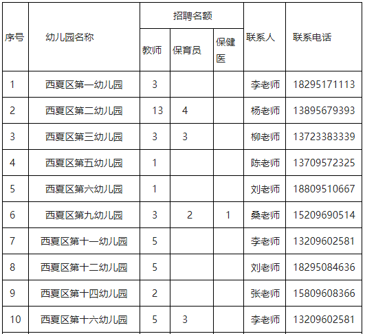 為不斷推進(jìn)西夏區(qū)學(xué)前教育優(yōu)質(zhì)發(fā)展,加強(qiáng)幼兒園教師隊(duì)伍建設(shè),經(jīng)研究決定,現(xiàn)面向社會(huì)公開(kāi)招聘非在編幼兒園教師、保育員、保健醫(yī),共計(jì)166名(其中幼兒教師120名、保育員36名、保健醫(yī)10名)?,F(xiàn)將有關(guān)事項(xiàng)公告如下: