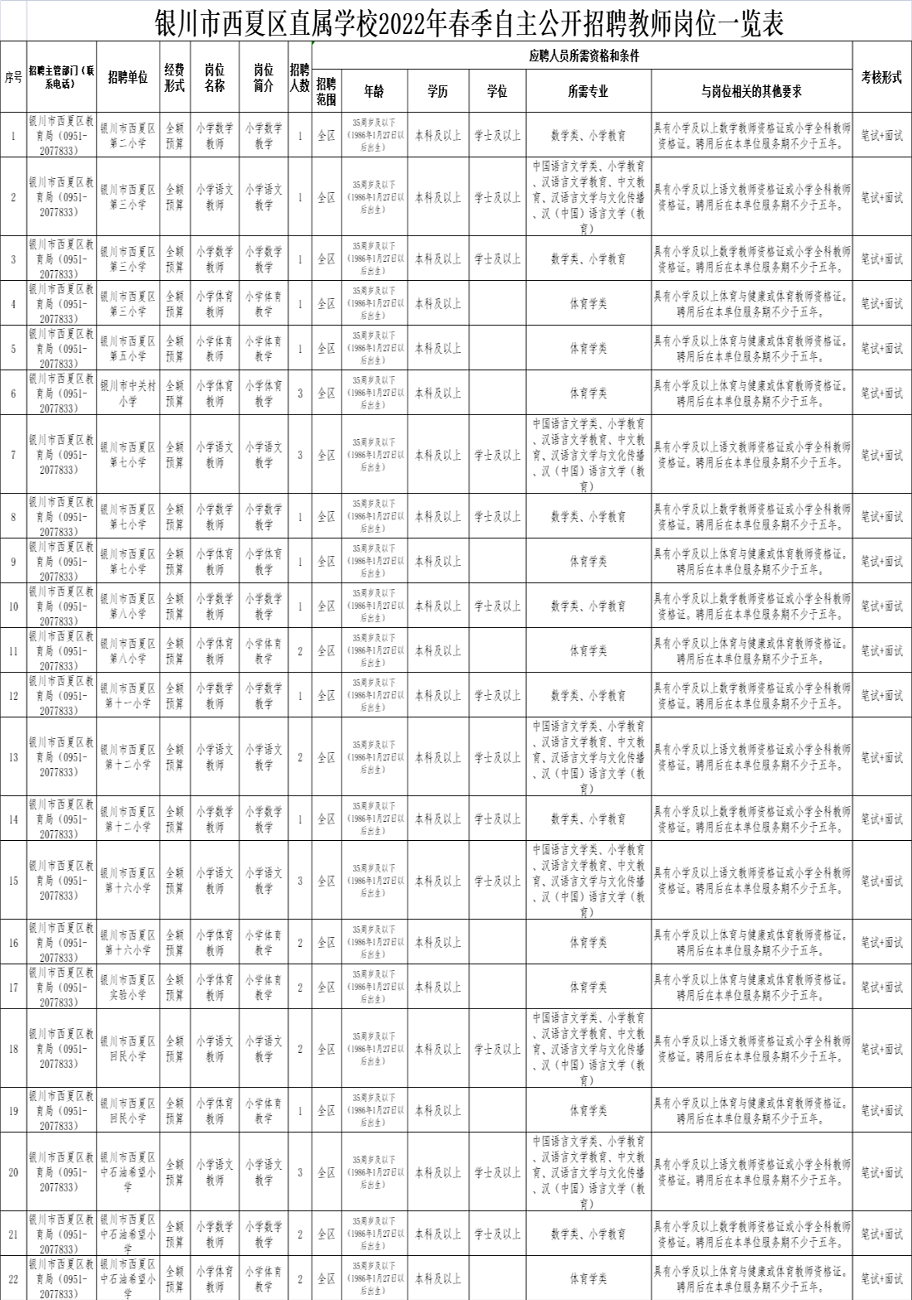(三)本次招聘應聘人員所需資格和條件在《銀川市西夏區(qū)直屬學校2022年春季自主公開招聘教師崗位一覽表》中詳述,請應聘者務必認真閱讀。