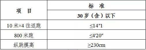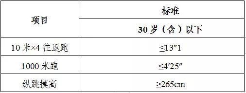 (二)體能測評的內(nèi)容和要求。體能測評參照《公安機關錄用人民警察體能測評項目和標準(暫行)》(人社部發(fā)〔2011〕48號)、國家公務員局《關于明確公安機關人民警察體能測評次數(shù)的函》(國公局函〔2012〕1號)相關要求執(zhí)行。共設三項:男子1000米跑和女子800米跑(測評次數(shù)均為1次)、10米×4往返跑(測評次數(shù)不超過2次)、縱跳摸高(測評次數(shù)不超過3次)。體能測評的三個項目中有任何一項不合格或違規(guī),視為體能測評不合格。