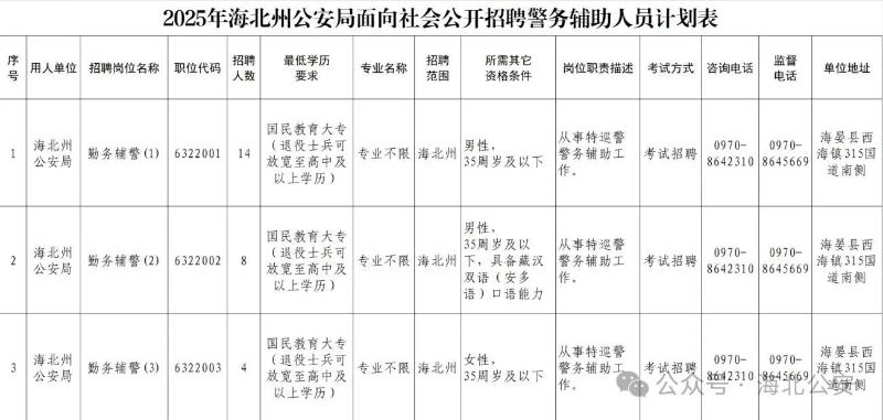 附:2025年海北州公安局面向社會公開招聘警務(wù)輔助人員計劃表