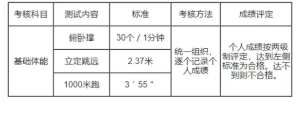 體能測試主要項目:1000米跑、仰臥起坐、立定跳遠,各項目測試標準如下: