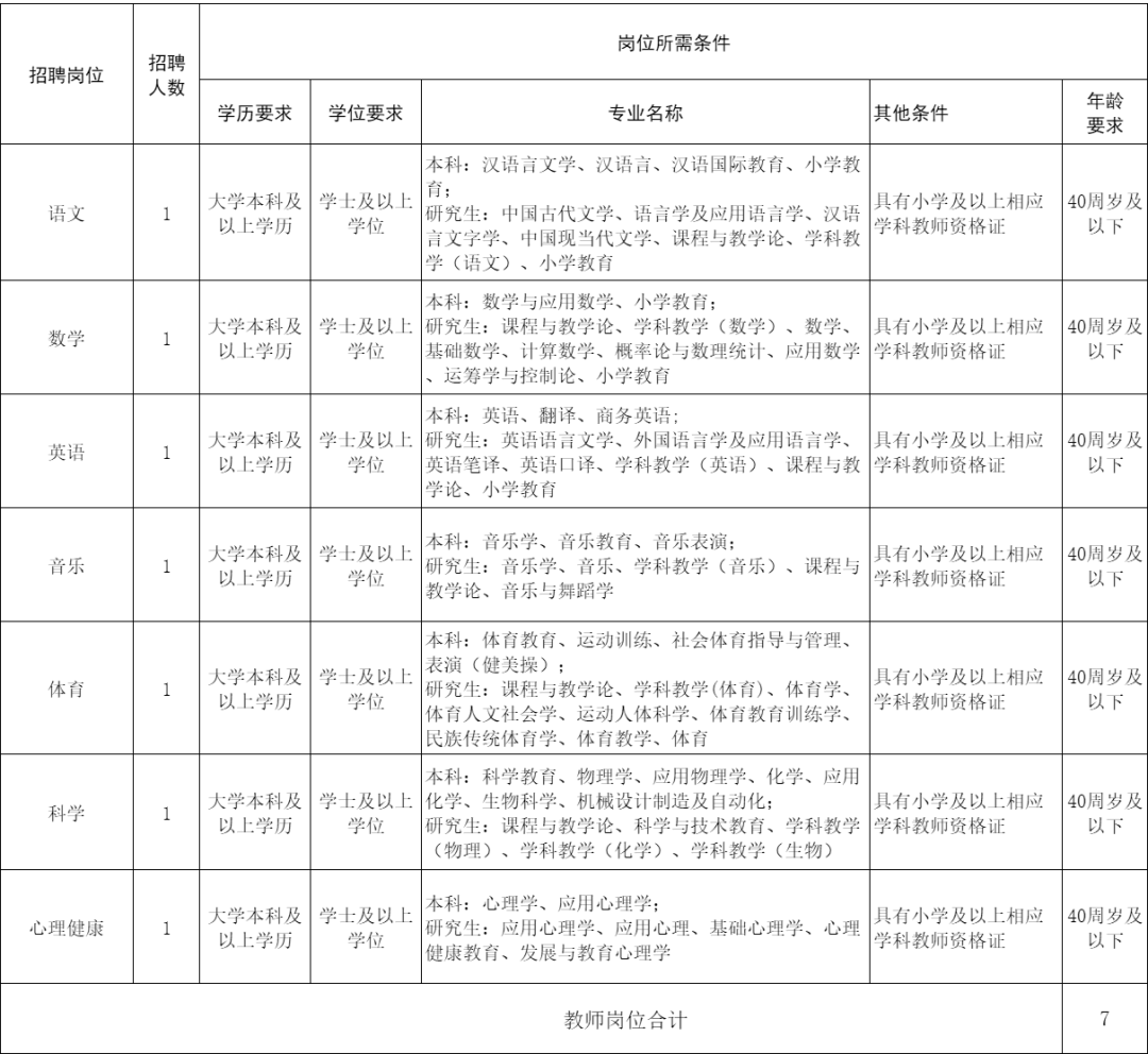 小學(xué)語(yǔ)文:5人、小學(xué)數(shù)學(xué):3人、小學(xué)英語(yǔ):2人、小學(xué)體育:1人、小學(xué)音樂(lè):1人、小學(xué)美術(shù):2人、小學(xué)道德與法治:1人 、小學(xué)信息技術(shù):1人、財(cái)務(wù):1人。