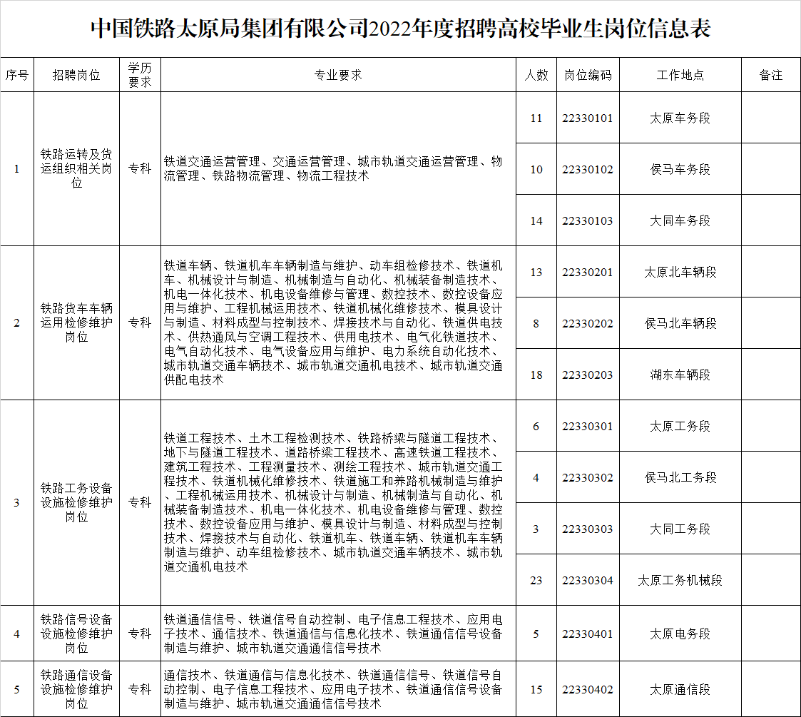 招聘崗位、學歷、專業(yè)、人數(shù)和工作單位等內(nèi)容詳見《中國鐵路太原局集團有限公司2022年度招聘高校畢業(yè)生崗位信息表》。
