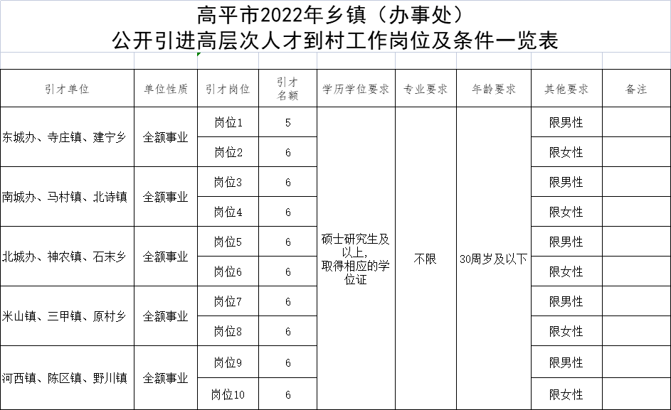 附件1:《高平市2022年鄉(xiāng)鎮(zhèn)(辦事處)公開(kāi)引進(jìn)高層次人才到村工作崗位及條件一覽表》