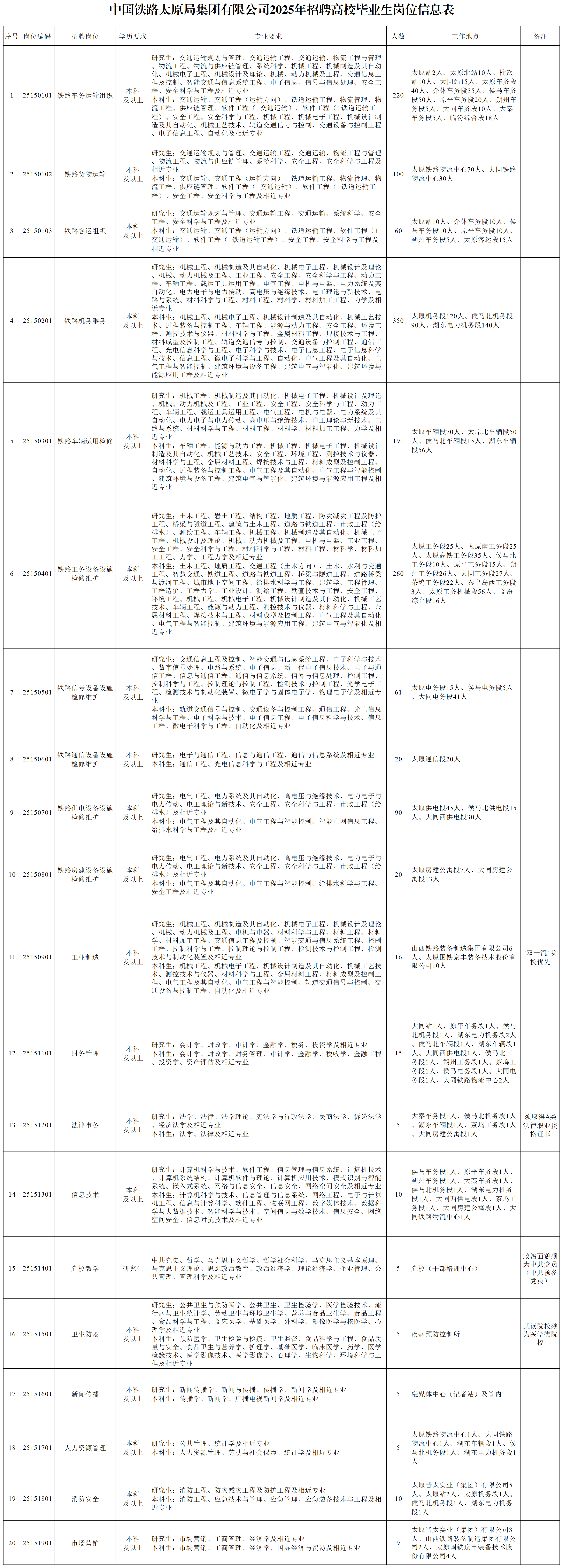 2024-11-02 14:37:50閱讀()中國鐵路太原局集團(tuán)有限公司根據(jù)企業(yè)發(fā)展需要,現(xiàn)將2025年普通高等院校研究生和全日制本科學(xué)歷畢業(yè)生招聘有關(guān)事項(xiàng)公告如下: