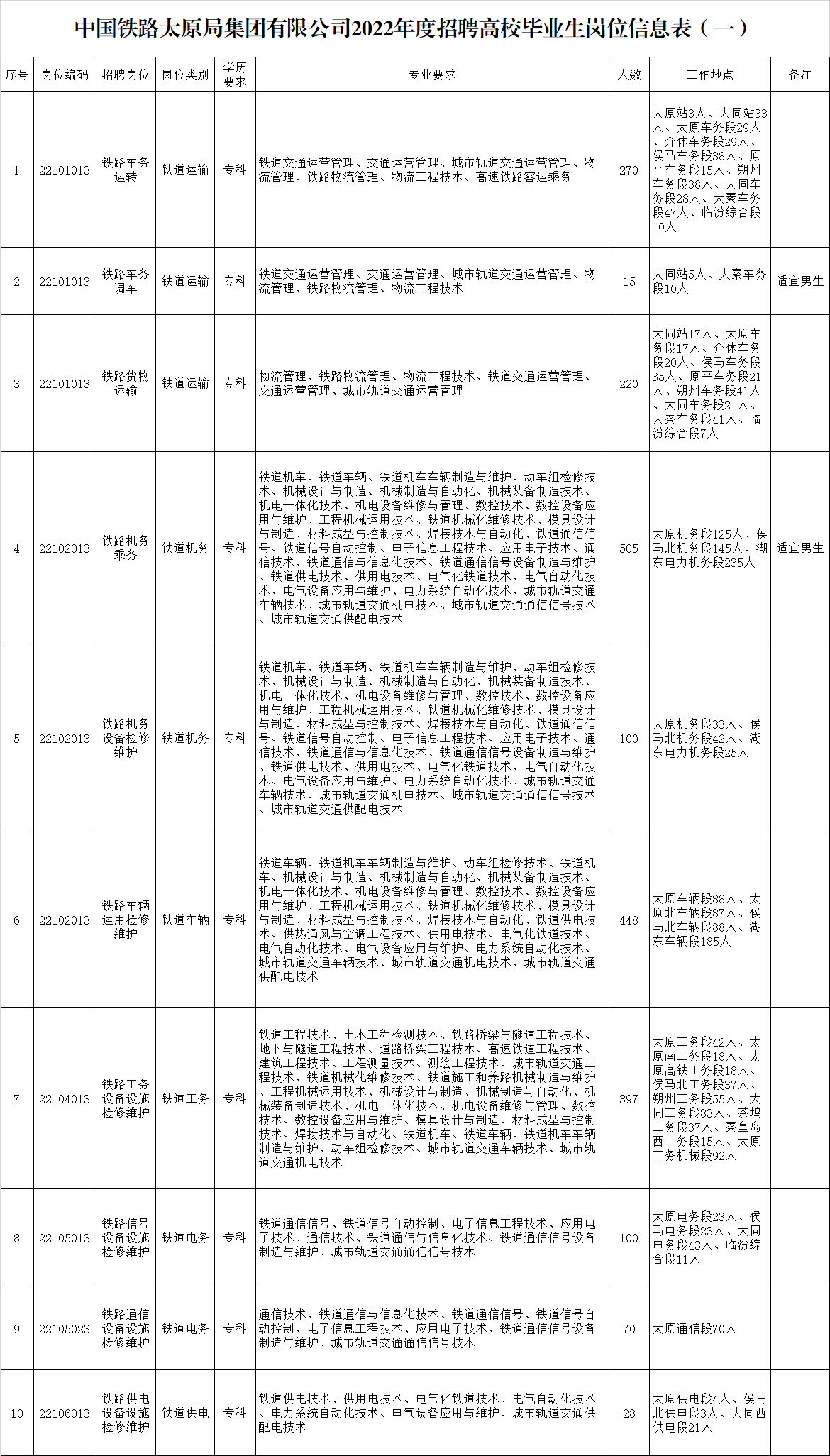 招聘崗位、學歷、專業(yè)、人數(shù)和工作地點等內容詳見《中國鐵路太原局集團有限公司2022年度招聘高校畢業(yè)生崗位信息表(一)》。
