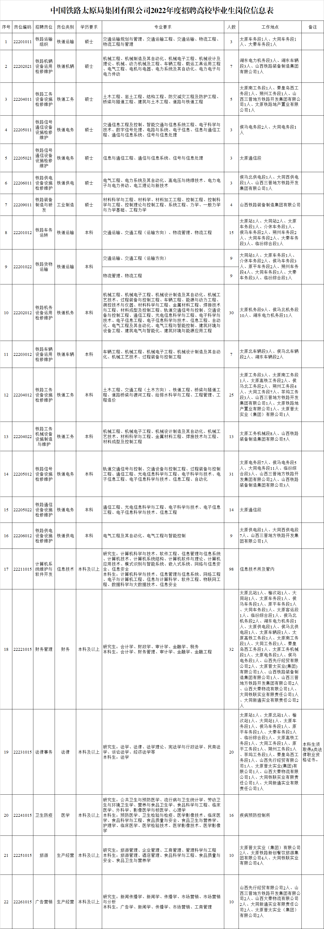 招聘崗位、學(xué)歷、專(zhuān)業(yè)、人數(shù)和工作地點(diǎn)等內(nèi)容詳見(jiàn)《中國(guó)鐵路太原局集團(tuán)有限公司2022年度招聘高校畢業(yè)生崗位信息表》。