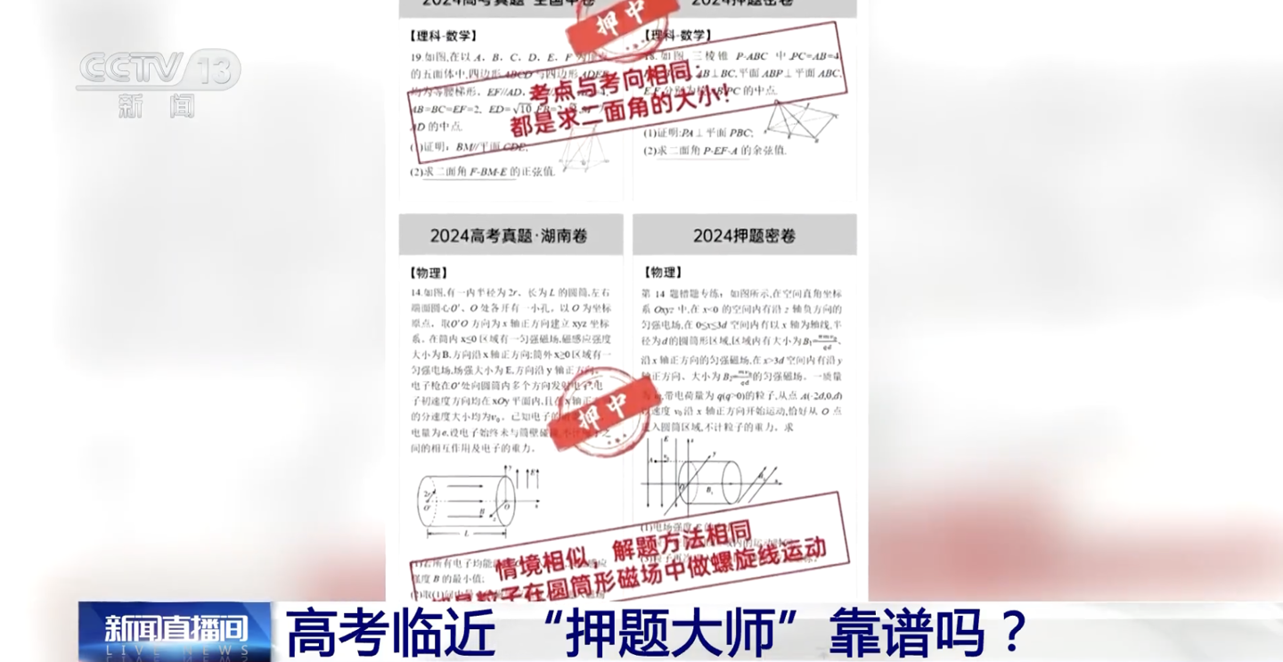 以2024年高考真題為例,央視網(wǎng)記者發(fā)現(xiàn)在某“AI高考押題卷”詳情中,列舉了各科多道“押中”題目,可再一細看,似乎又不是那么回事。一道數(shù)學幾何題,真題為五面體,押題卷為三棱錐,題干、設問均不相同,僅因均考查了“二面角的大小”這同一個考點,就判定為“押中”。