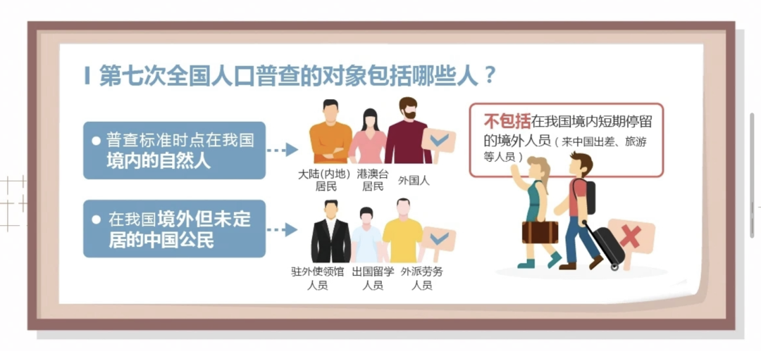 普查對象是普查標準時點在中華人民共和國境內的自然人以及在中華人民共和國境外但未定居的中國公民,不包括在中華人民共和國境內短期停留的境外人員。