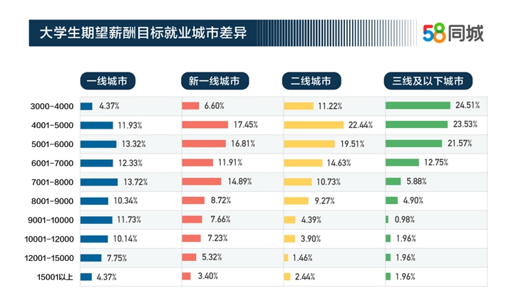 報告顯示,大學(xué)生平均期望月薪為7409元,企業(yè)對大學(xué)生平均支付月薪為7094元,大學(xué)生的收入水平基本符合預(yù)期構(gòu)想。大學(xué)生就業(yè)選擇的城市層級越高,薪酬期望也越高。首選在一線城市就業(yè)的大學(xué)生平均期望月薪為8151元,首選在新一線城市就業(yè)的大學(xué)生平均期望月薪為7394元,首選在二線城市就業(yè)的大學(xué)生平均期望月薪為6478元,首選在三線及以下城市就業(yè)的大學(xué)生平均期望月薪為5696元。
