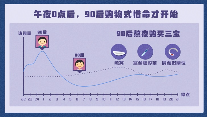 不過(guò),這屆90后怕死又作死,一邊“敷著最貴的面膜,吃著最貴的保健品”,一邊“熬著最晚的夜”。數(shù)據(jù)顯示,90后買養(yǎng)生產(chǎn)品的高峰時(shí)間是每天的12點(diǎn)以后。