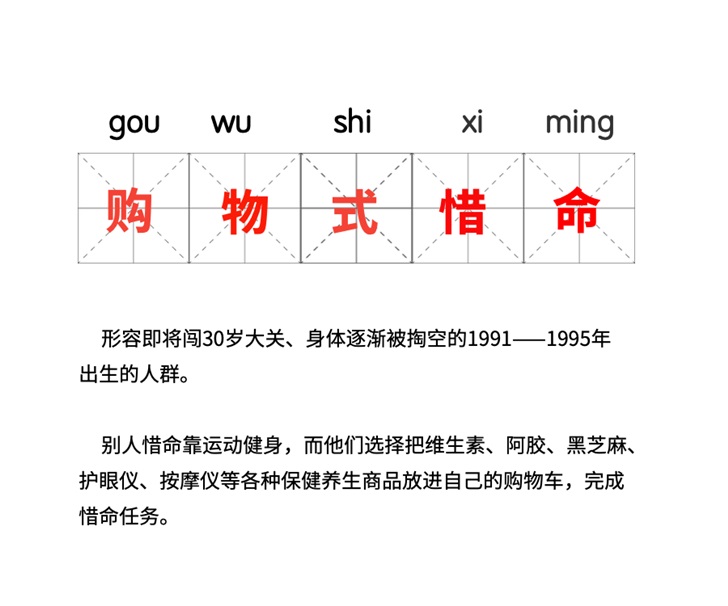近三個(gè)月,燕窩和食用阿膠糕在淘寶天貓平臺(tái)的銷量分別增長(zhǎng)了146%、232%,枸杞的銷量提升了355%,肩頸按摩儀銷量增長(zhǎng)253%,宮頸癌疫苗的預(yù)約人數(shù)增長(zhǎng)509%,基因類產(chǎn)品的銷量增長(zhǎng)了400%,而購(gòu)買這些商品的,過(guò)半數(shù)都是90后。