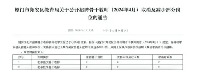 日前,網(wǎng)傳廈門(mén)市翔安區(qū)骨干教師招聘因多崗位取消編制導(dǎo)致無(wú)人報(bào)考,只能取消招聘計(jì)劃。廈門(mén)市翔安區(qū)教育局發(fā)布的一則《關(guān)于公開(kāi)招聘骨干教 ...
