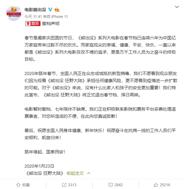 今天中午@電影熊出沒 23日發(fā)布撤檔聲明,2020年鼠年春節(jié),全國人民正在眾志成城抵抗新型病毒,我們不愿看到觀眾朋友們因為觀看《熊出沒· ...