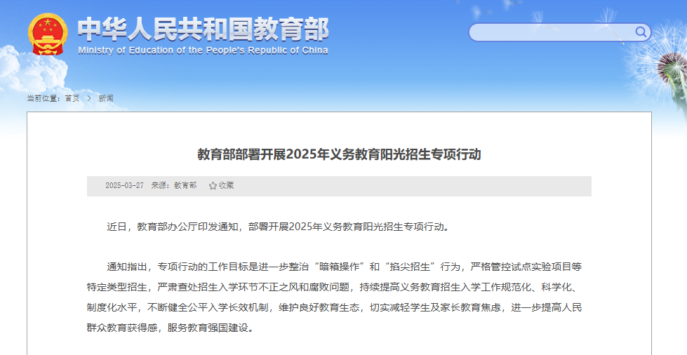 教育部部署開展2025年義務(wù)教育陽光招生專項(xiàng)行動(dòng)近日,教育部辦公廳印發(fā)通知,部署開展2025年義務(wù)教育陽光招生專項(xiàng)行動(dòng)。通知指出,專項(xiàng)行動(dòng) ...