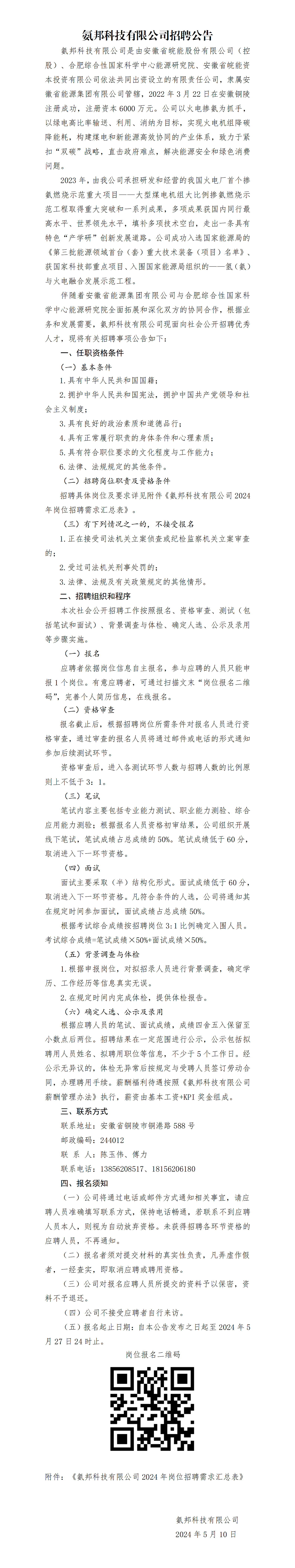 伴隨著安徽省能源集團有限公司與合肥綜合性國家科學(xué)中心能源研究院全面拓展和深化雙方的協(xié)同合作,根據(jù)業(yè)務(wù)和發(fā)展需要,氨邦科技有限公司現(xiàn)面向社會公開招聘優(yōu)秀人才,現(xiàn)將有關(guān)招聘事項公告如下: