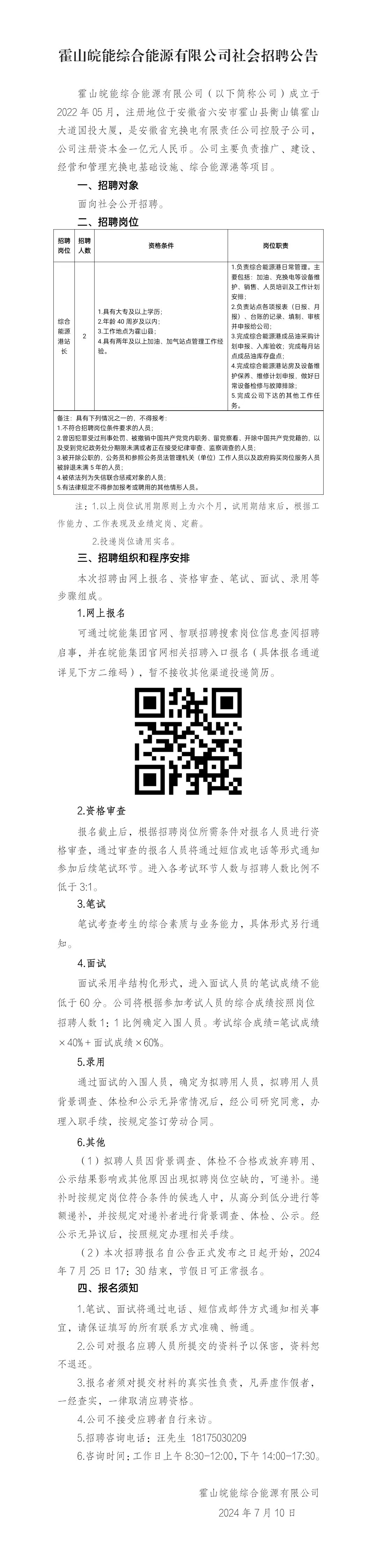 2024年六安霍山皖能綜合能源有限公司社會(huì)招聘公告