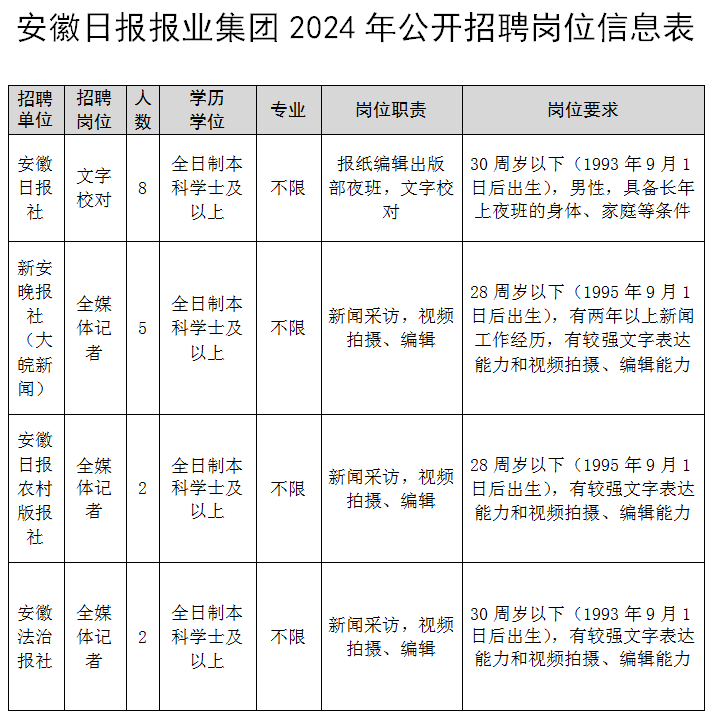 詳見(jiàn)《安徽日?qǐng)?bào)報(bào)業(yè)集團(tuán)2024年公開(kāi)招聘崗位信息表》。