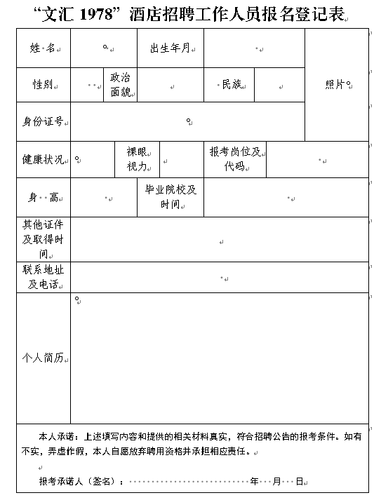 報名時提交①本人有效居民身份證、②學(xué)歷證書、③有效的無犯罪記錄證明、④各類專業(yè)證書、職稱證書的原件及填寫好的《“文匯1978”酒店招聘工作人員報名登記表》(貼近期1寸免冠證件照片)的原件及復(fù)印件。