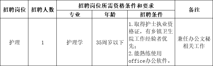 因工作需要,休寧縣萬(wàn)安鎮(zhèn)衛(wèi)生院經(jīng)研究決定通過(guò)黃山市仁和人力資源服務(wù)有限公司面向社會(huì)公開(kāi)招聘護(hù)理人員1名,現(xiàn)將有關(guān)事項(xiàng)公告如下: