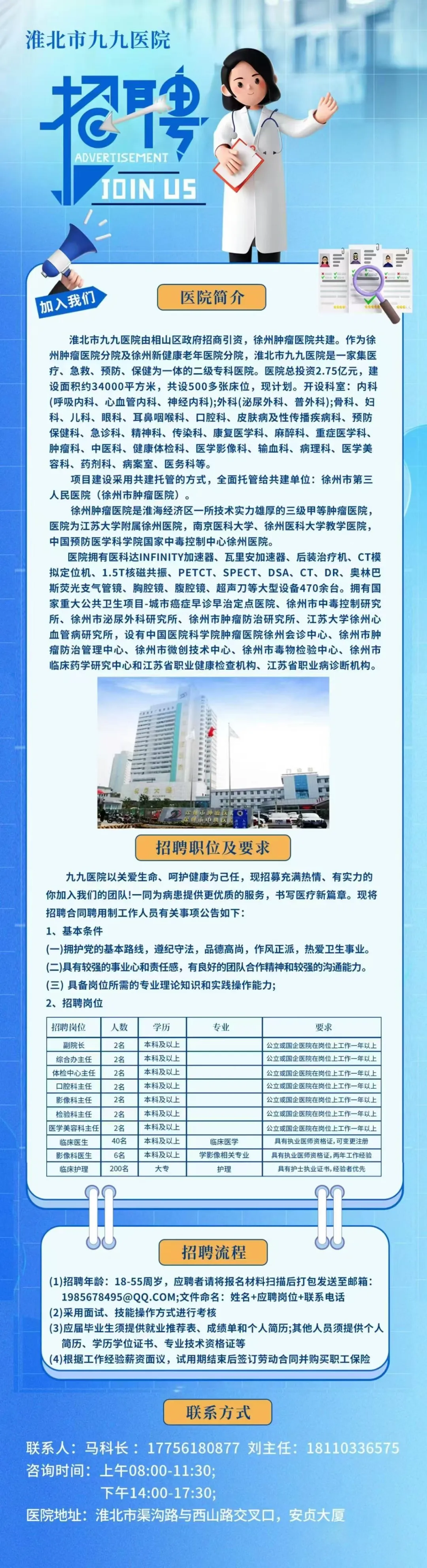 淮北市九九醫(yī)院由相山區(qū)政府招商引資,徐州腫瘤醫(yī)院共建。作為徐州腫瘤醫(yī)院分院及徐州新健康老年醫(yī)院分院,淮北市九九醫(yī)院是一家集醫(yī)療、急救、預(yù)防、保健為一體的二級(jí)專(zhuān)科醫(yī)院。醫(yī)院總投資2.75億元,建設(shè)面積約34000平方米,共設(shè)500多張床位,現(xiàn)計(jì)劃。開(kāi)設(shè)科室:內(nèi)科(呼吸內(nèi)科、心血管內(nèi)科、神經(jīng)內(nèi)科);外科(泌尿外科、普外科);骨科、婦科、兒科、眼科、耳鼻咽喉科、口腔科、皮膚病及性傳播疾病科、預(yù)防保健科、急診科、精神科、傳染科、康復(fù)醫(yī)學(xué)科、麻醉科、重癥醫(yī)學(xué)科、腫瘤科、中醫(yī)科、健康體檢科、醫(yī)學(xué)影像科、輸血科、病理科、醫(yī)學(xué)美容科、藥劑科、病案室、醫(yī)務(wù)科等。