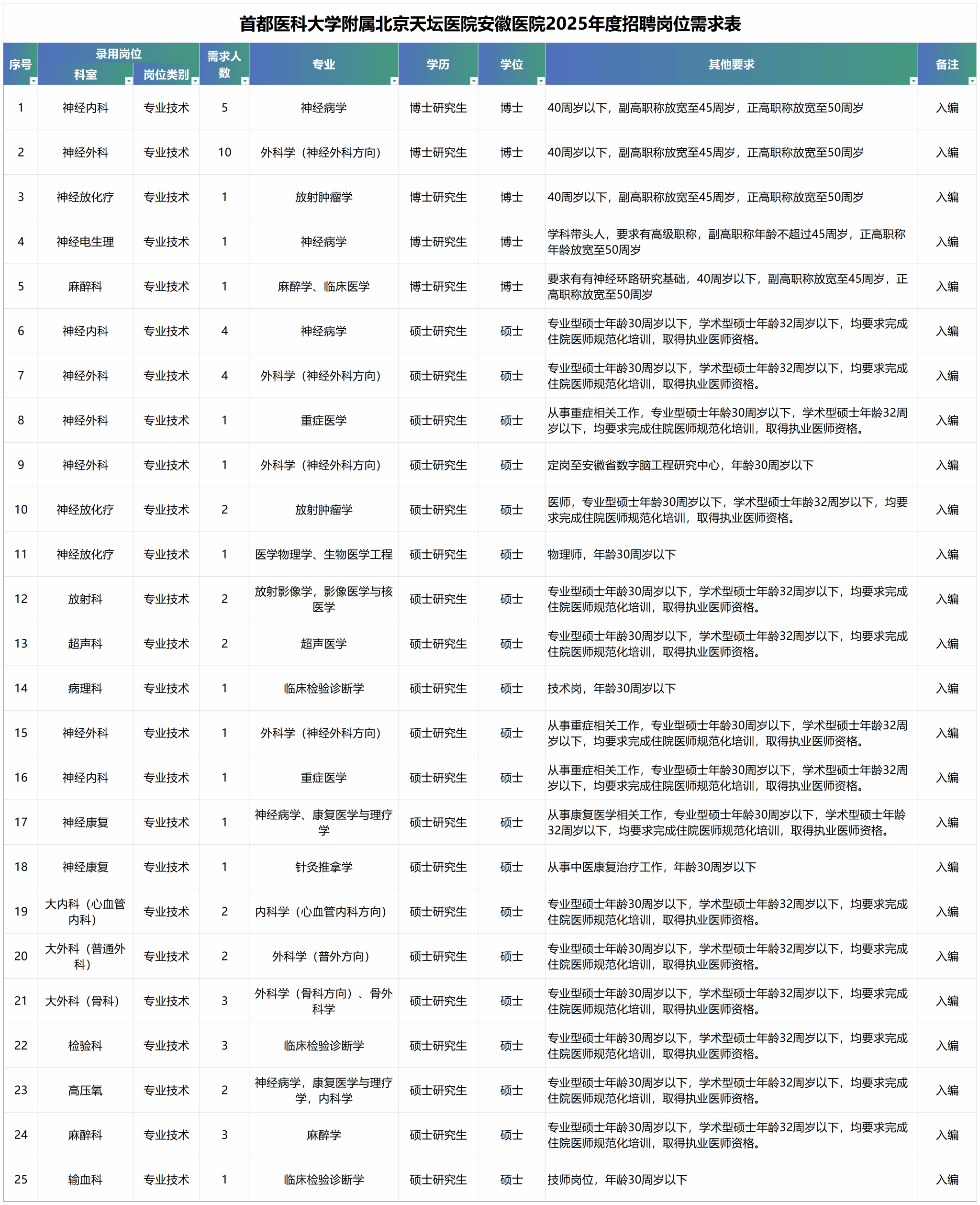 2025年度安徽醫(yī)院公開(kāi)招聘碩士及以上高層次人才56人,具體崗位信息詳見(jiàn)下表: