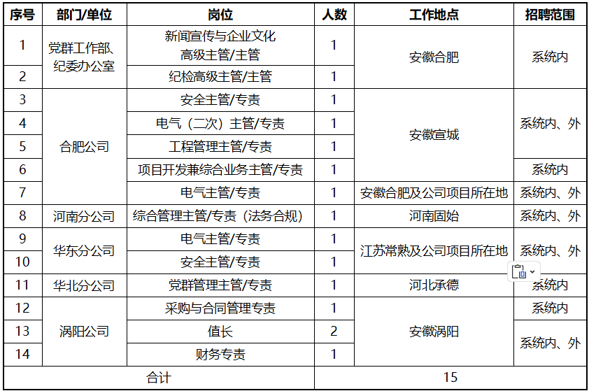根據(jù)工作需要,現(xiàn)招聘安徽公司本部及所屬單位相關(guān)崗位。具體事項公告如下: