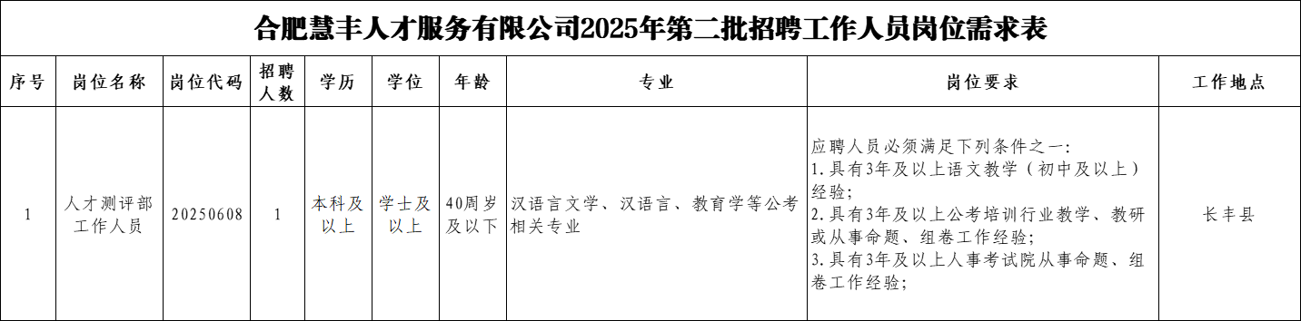 附件1:合肥慧豐人才服務有限公司2025年第二批招聘工作人員崗位需求表