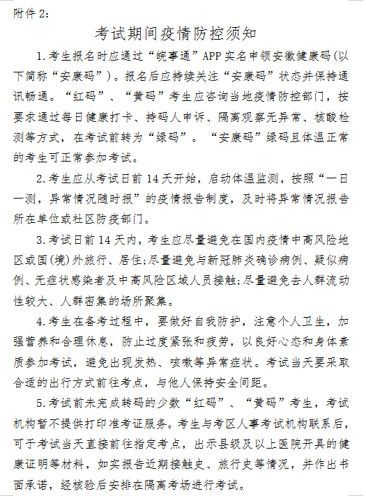 報考人員報名前,應(yīng)通過“皖事通”APP實名申領(lǐng)“安康碼”。報考人員報考前請認真閱讀《考試期間疫情防控須知》(附件2)。報考人員提供的信息必須與本人實際情況、報考條件和所報考的崗位要求相一致。凡弄虛作假通過資格審查,其實際情況與報考條件規(guī)定不符的,一經(jīng)查實,即取消考試、聘用等資格。