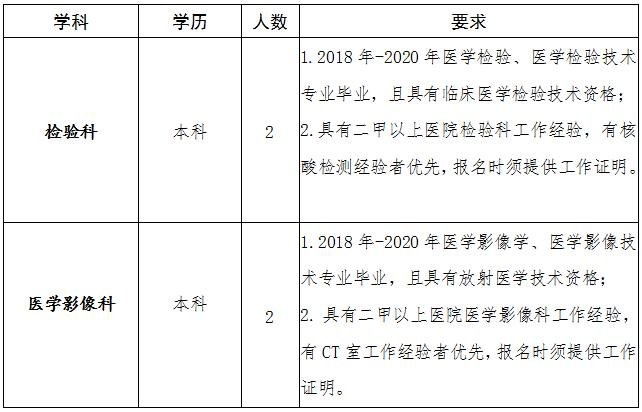 2021-02-01 18:15:41閱讀()太和縣人民醫(yī)院根據(jù)2021年檢驗(yàn)科和醫(yī)學(xué)影像科招聘計(jì)劃,結(jié)合疫情期間急需崗位需要,經(jīng)2021年1月30日院長(zhǎng)辦公會(huì)議研究,現(xiàn)對(duì)檢驗(yàn)科(核酸檢測(cè)室)和醫(yī)學(xué)影像科(CT室)急需人員面向社會(huì)公開招聘。