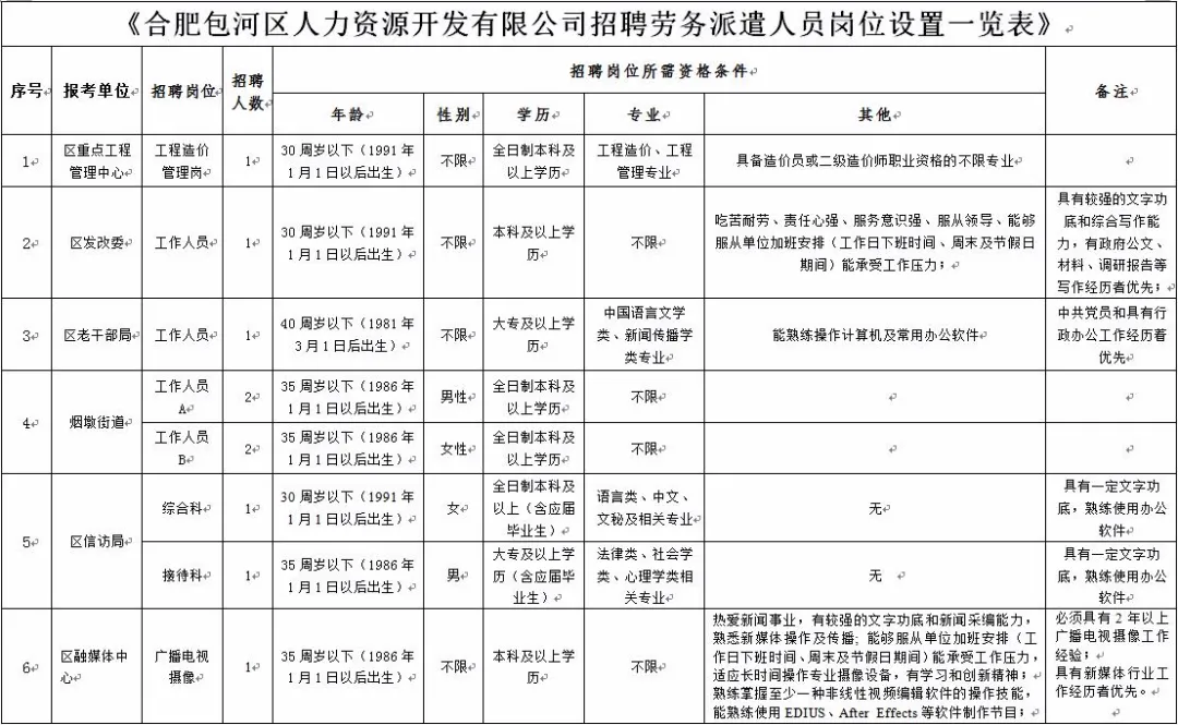 招聘崗位及要求見(jiàn)附件《合肥包河區(qū)人力資源開(kāi)發(fā)有限公司招聘勞務(wù)派遣人員崗位設(shè)置一覽表》