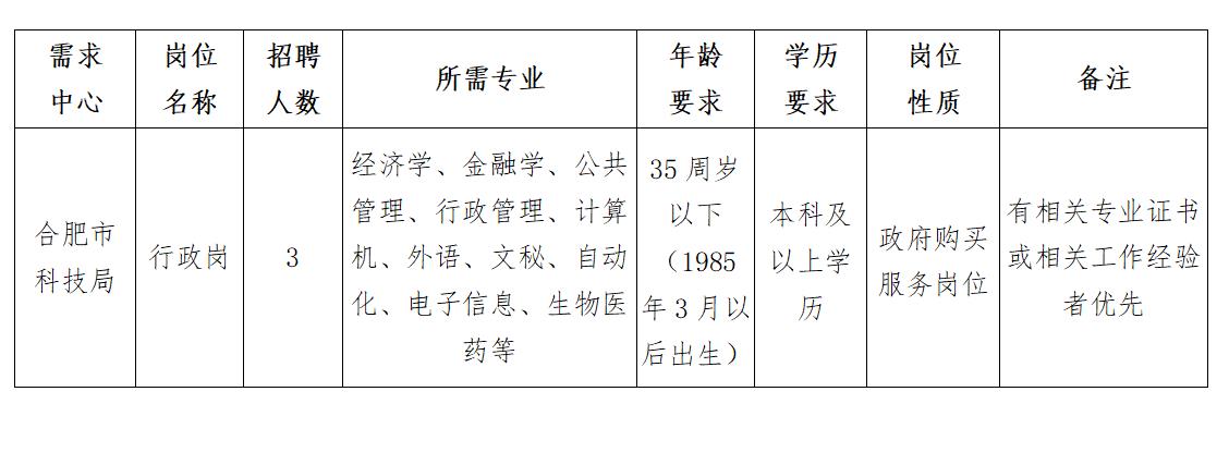 因工作需要,合肥市科學技術(shù)局現(xiàn)擬面向社會公開招聘政府購買服務崗位工作人員3名。現(xiàn)就有關(guān)事項公告如下: