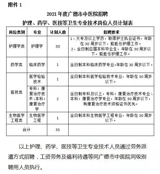 經(jīng)廣德市中醫(yī)院委托,按照公開、平等、競(jìng)爭(zhēng)、擇優(yōu)的原則,面向社會(huì)公開招聘護(hù)理人員30名、藥學(xué)1名、醫(yī)技3名、生物醫(yī)學(xué)工程1名,由我公司派遣至廣德市中醫(yī)院工作,現(xiàn)將有關(guān)事項(xiàng)公告如下。